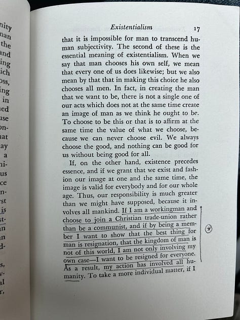 He continues: “Our responsibility is much greater than we might have supposed, because it involves all of mankind. If I am a working man and choose to join a Christian trade-union rather than be a communist, and if by being a member I want to show that the best thing for man is resignation, that the kingdom of man is not of this world, I am not only involving my own case—I want to be resigned for everyone. As a result, my action has involved all humanity. To take a more individual matter, if I want to marry, to have children; even if this marriage depends solely on my own circumstances or passion or wish, I am involving all of humanity in monogamy and not merely myself. Therefore, I am responsible for myself and for everyone else. I am creating a certain image of man of my own choosing. In choosing myself, I choose man” (17-18).