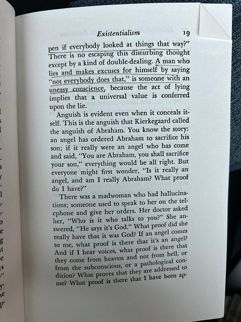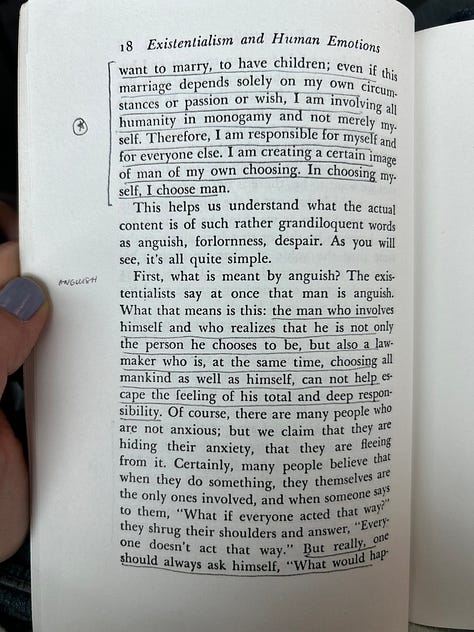 My silly dean told my thesis group that writing is the best method for processing the material that you read. I often have an urge to share what I’m reading, and usually this manifests in me reading it aloud if I’m around people, underlining and dog-earing the corner of the page if I’m not. On Monday on the plane I encountered something that I wanted to share with like ten people, which is not a feeling that I have very frequently. This morning I finished the book I had started on my flight, Existentialism and Human Emotions, a little book of essays by Jean-Paul Sartre that I found on a shelf at home, and I’m not going to tell you how long it took me to finish because it’s better for both of us if you don’t know.